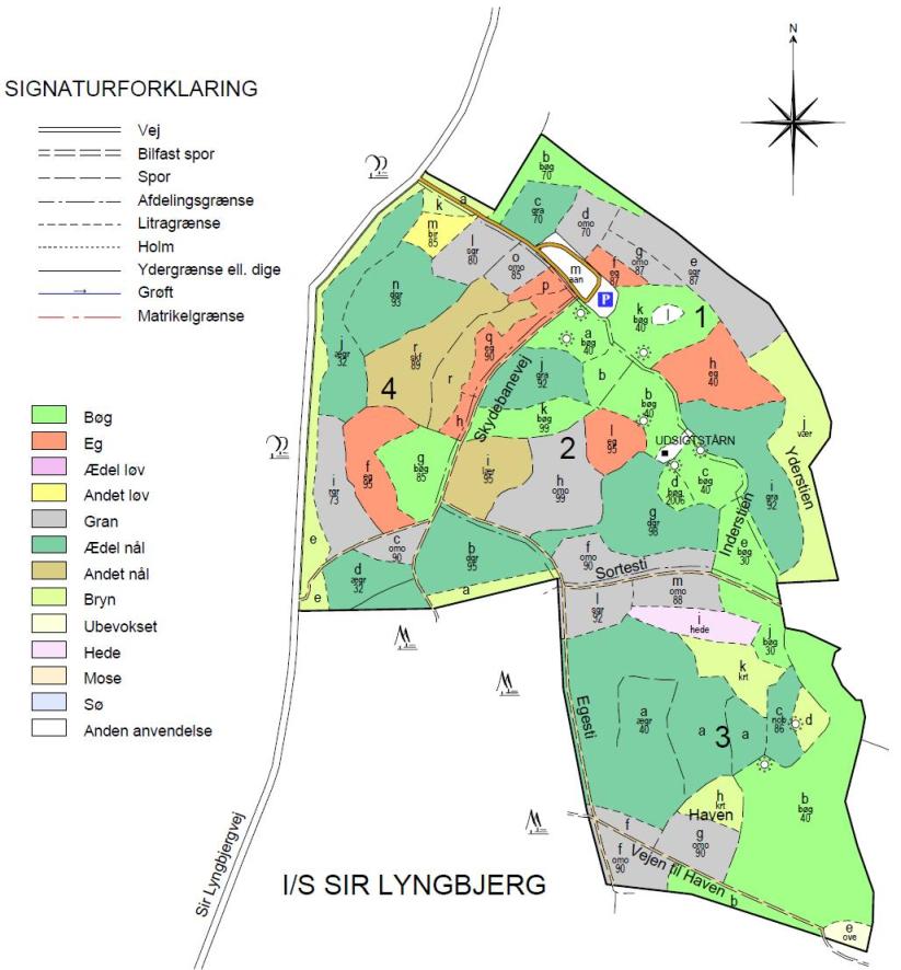 Sir Lyngbjerg Plantages bevoksninger er spredt over et relativt bredt spektrum af aldre, bevoksningsstørrelser og træarter. En tredjedel af det bevoksede areal udgøres af løvtræer, med hovedvægten på bøg. Nåletræet udgør de resterende knapt 2/3 af det bevoksede areal. Heraf udgør de ædle nå-letræarter som ædelgran og douglasgran m.fl. godt 55%. Blandt andet findes et større areal med afdriftsmoden ædelgran.